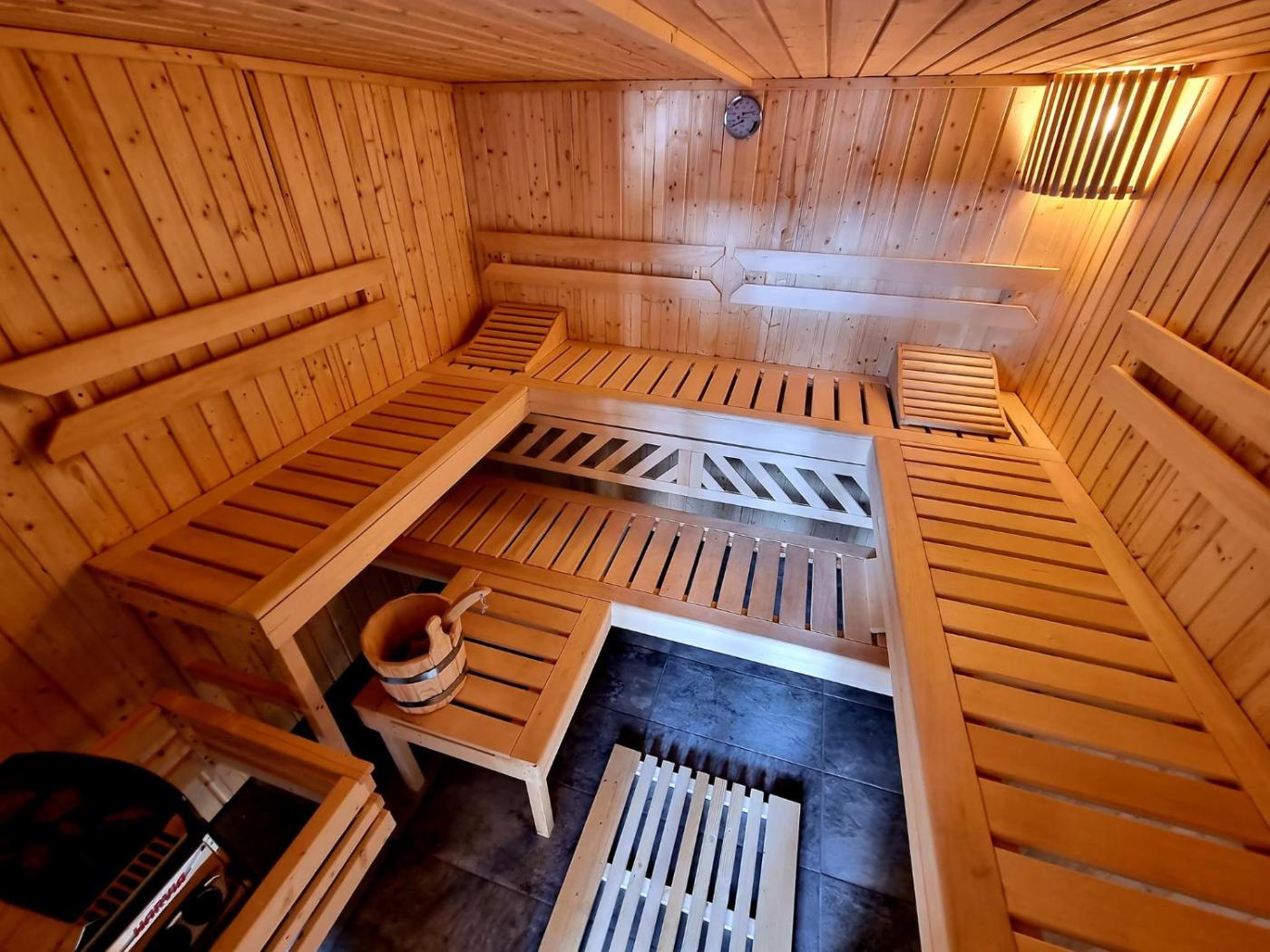 Dom z 2 sypialniami. Jest to luksusowy dom wakacyjny z sauną, wanną z hydromasażem i basenem z widokiem na okolicę. Ten dom wakacyjny z prywatnym wejściem mieści 2 oddzielne sypialnie, salon oraz łazienkę z prysznicem i suszarką do włosów. Na gości czeka dobrze wyposażona kuchnia, w której przygotowano dla nich lodówkę, płytę kuchenną, przybory kuchenne i kuchenkę mikrofalową. Goście zatrzymujący się w tym domu wakacyjnym mogą korzystać z grilla. Ten dom wakacyjny z tarasem z widokiem na ogród oferuje również część wypoczynkową oraz telewizor z płaskim ekranem i dostępem do kanałów satelitarnych. W tej opcji zakwaterowania do dyspozycji gości jest 5 łóżek. Dom wakacyjny - 8 osobowy. Powierzchnia pokoju ok.: 51 mkw. ;